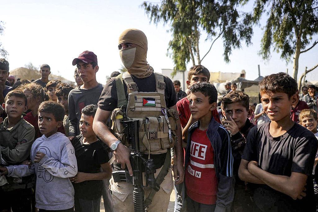 Photo : un milicien du Hamas se tient au milieu d’une foule qui lui sert de bouclier humain, à Deir el-Balah, dans la bande de Gaza, le 13 octobre 2025. (Photo de Bashar Taleb/AFP via Getty Images)