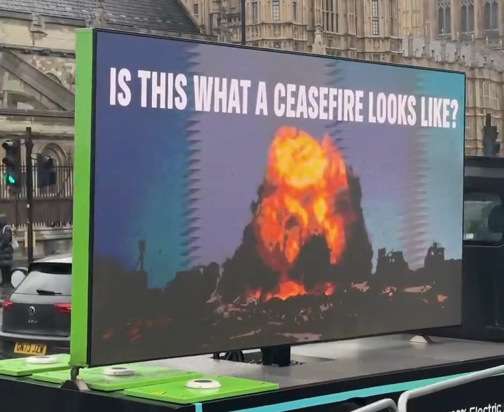Angleterre : grands écrans à Westminster pour montrer que le génocide à Gaza continue