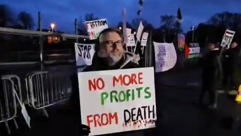 Des militants ont manifesté devant le salon international des véhicules blindés de Farnborough, dans le Hampshire, pour condamner les entreprises fournissant les armes utilisées dans la guerre israélienne contre Gaza et réclamer un embargo immédiat sur les armes.