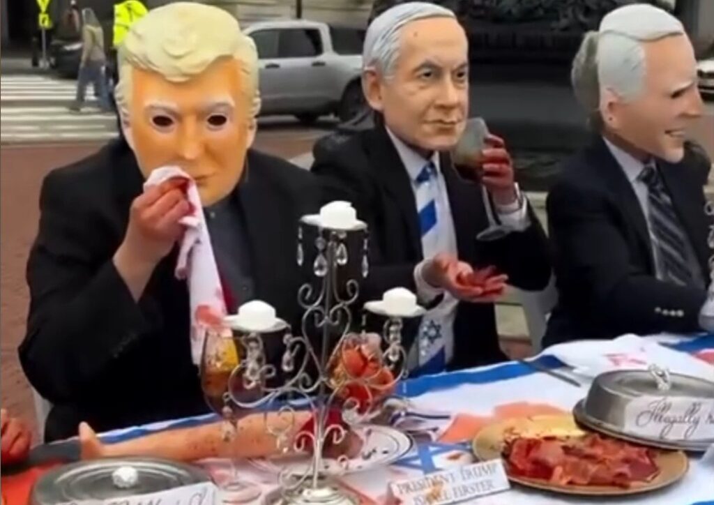 Des militants ont organisé une manifestation par ordinaire devant la gare Union Station de Washington, D.C., à la veille de Thanksgiving, présentant un « banquet de sang » symbolique, mettant en scène des personnalités américaines aux côtés de Netanyahou, criminel de guerre recherché par la CPI.
