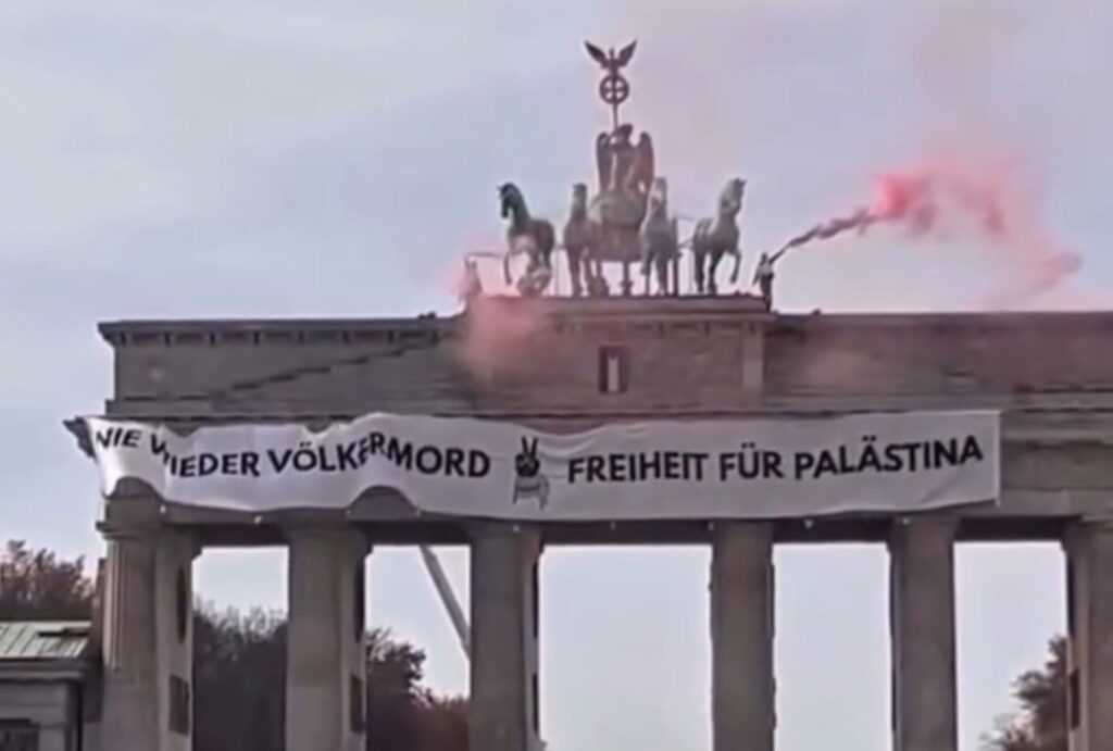 A la porte de Brandebourg à Berlin, des militants ont brandi une grande banderole et le drapeau palestinien dans une puissante démonstration de solidarité avec Gaza, une scène saisissante et sans précédent au cœur de la capitale allemande.