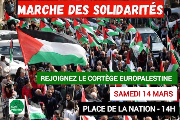...LES ANTI Ce samedi, contre les guerres, le racisme et le fascisme, tous place de la Nation ! Vues: 7 Date: 12 mars 2026 URL has been copied successfully! URL has been copied successfully! Rejoignez nombreux-se, ce samedi à 14 H, le cortège Europalestine à Paris, place de la Nation à 14 H! CAPJPO-Europalestine Article en PDF La source de cet article se trouve sur ce site Article précédentIran : les enfants ne sont pas épargnésArticle suivantLa guerre que mènent les Etats-Unis et Israël contre l’Iran risque de faire très mal aux économies du golfe Persique. LAISSER UN COMMENTAIRE Annuler la réponse Commenter : S'il vous plaît entrez votre commentaire! Nom : S'il vous plaît entrez votre nom ici Email : Vous avez entré une adresse email incorrecte! Veuillez entrer votre adresse email ici Site : Enregistrer mon nom, email et site web dans ce navigateur pour la prochaine fois que je commenterai. Δ PARTAGER: FacebookTwitterPinterestWhatsApp
