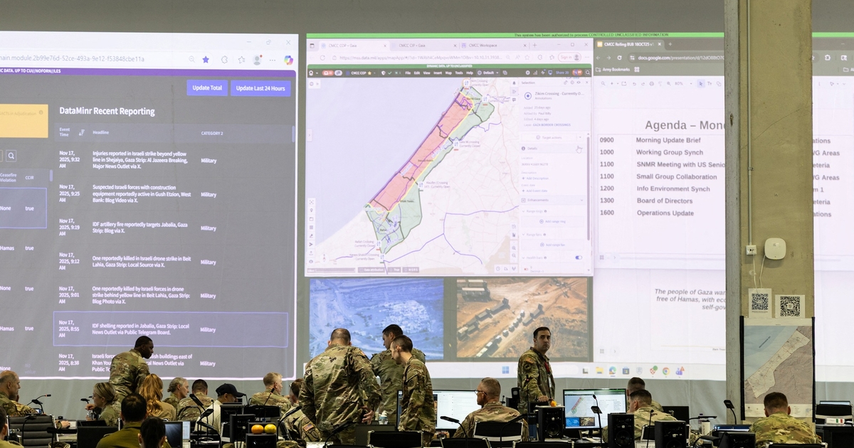 Ouvert le 17 octobre dans une zone industrielle, le bâtiment abrite environ 200 militaires américains, des officiers israéliens et plusieurs centaines de représentants de nombreux pays réunis dans un vaste open-space où diplomates, militaires et experts humanitaires travaillent devant des murs de cartes et d’écrans. Le centre est dirigé par le général Patrick Frank et l’ambassadeur Steven Fagin, dans le cadre du plan en 20 points porté par Donald Trump et validé au Conseil de sécurité.