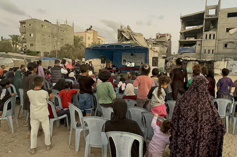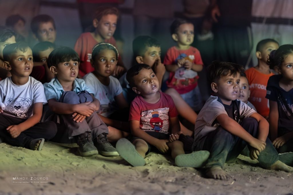 Des enfants de Gaza se rassemblent autour d’un petit écran dans un camp de réfugiés, partageant des moments de joie en regardant un film. Une brève parenthèse dans la dure réalité qui les entoure.