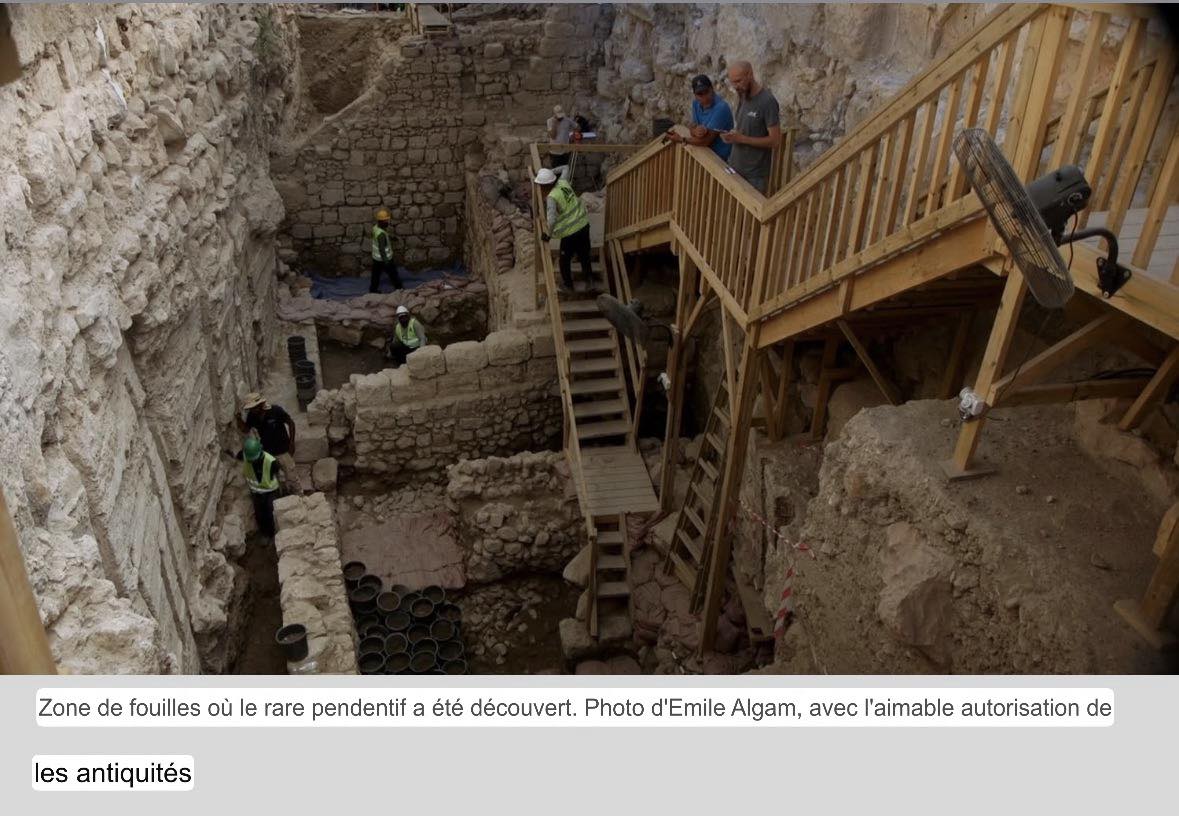 Le pendentif a été découvert dans une couche de remblai d’environ 8 mètres d’épaisseur, qui servait de fondation à un ensemble de bâtiments monumentaux de l’époque omeyyade. Cette couche recouvrait entièrement des vestiges plus anciens, datant de la fin de l’époque byzantine, notamment des ruines de bâtiments. Selon les chercheurs, ces vestiges témoignent d’un agencement architectural planifié, construit à proximité d’une rue pavée.