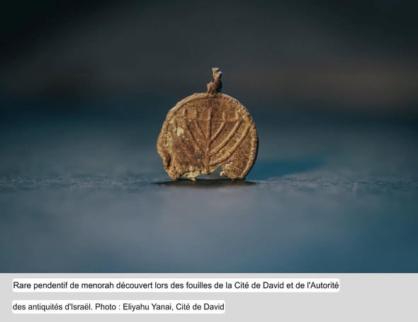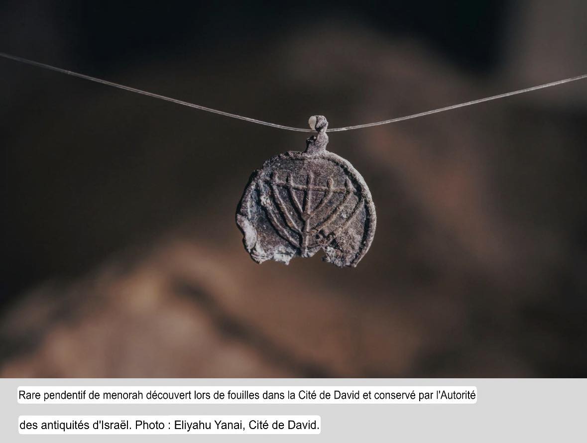 Un pendentif personnel très rare, datant du VIIe siècle de notre ère (fin de l’époque byzantine), a été découvert lors de fouilles archéologiques de grande envergure menées par l’Autorité des antiquités d’Israël, en collaboration avec l’Association de la Cité de David et la Société pour la restauration et le développement du quartier juif, dans le parc archéologique Davidson de Jérusalem. Cette pièce rare est ornée sur ses deux faces d’une représentation identique de la menorah à sept branches et aurait appartenu à un Juif arrivé à Jérusalem durant la période byzantine, alors que l’accès à la ville lui était interdit.