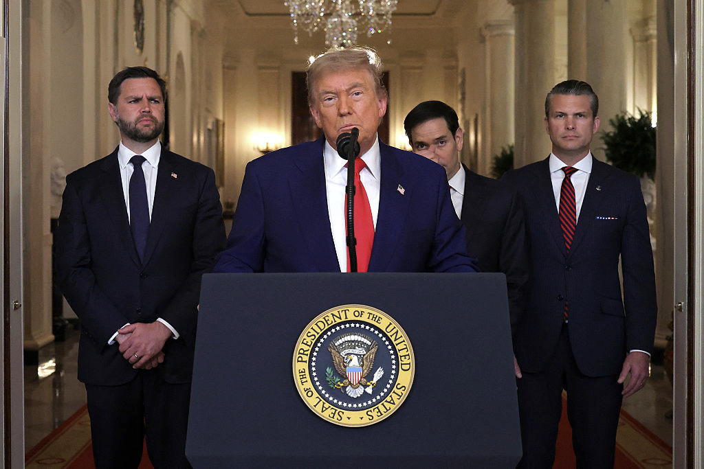 Photo : Trump s’adresse à la nation depuis la Maison-Blanche à Washington, le 21 juin 2025, après l’annonce du bombardement américain de sites nucléaires en Iran. (Photo de Carlos Barria/Pool/AFP via Getty Images)