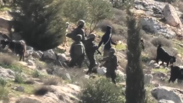 Sous la protection de l’armée israélienne, les colons ont amené leur bétail pour qu’il pâture parmi des arbres fruitiers sur des terres palestiniennes à Al-Mughayyir, au nord-est de Ramallah.