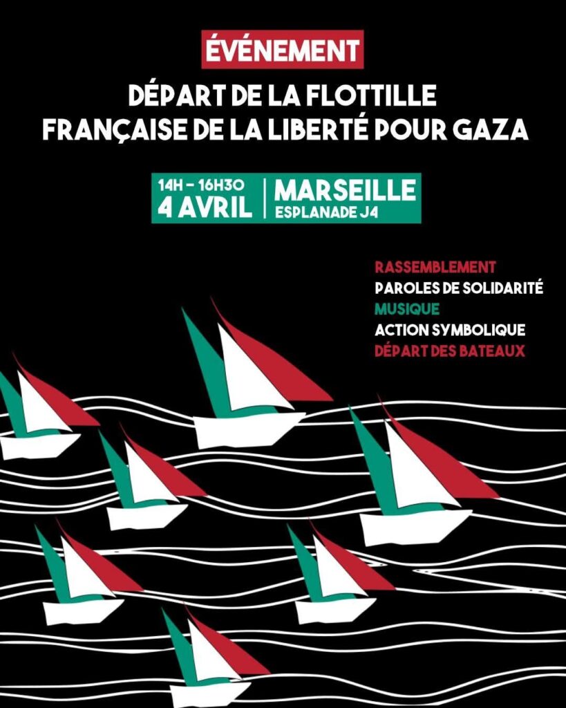 Ce samedi 4 avril, rendez-vous sur l’Esplanade J4 de Marseille à 14h pour participer au rassemblement de soutien et aux démonstrations de solidarité avec Gaza, avant le départ des bateaux de la campagne française de la Flottille de la Liberté pour Gaza et des Mille Madleens vers Gaza.