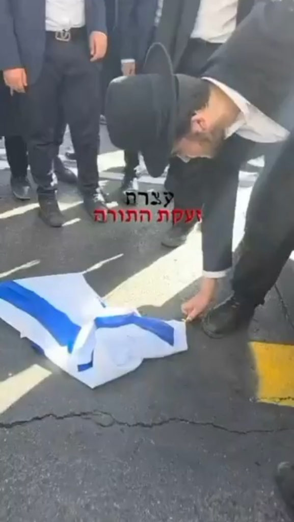 Des juifs haredim israéliens brûlent le drapeau israélien lors de manifestations contre la conscription obligatoire à Jérusalem.