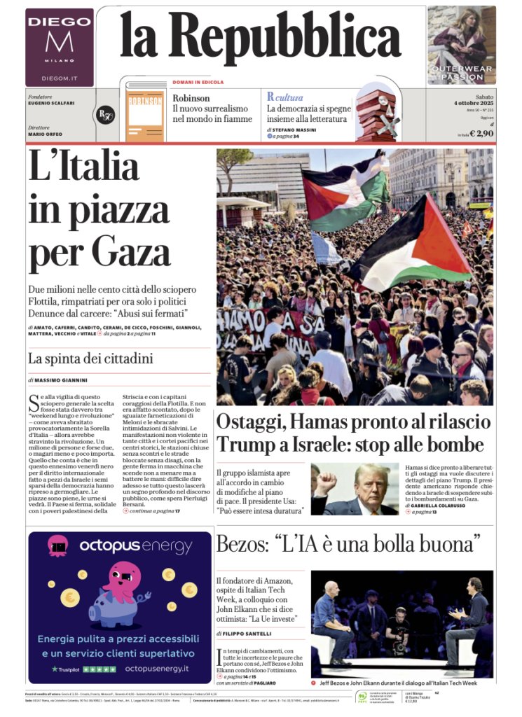 La « UNE » du quotidien le plus lu, la Repubblica :