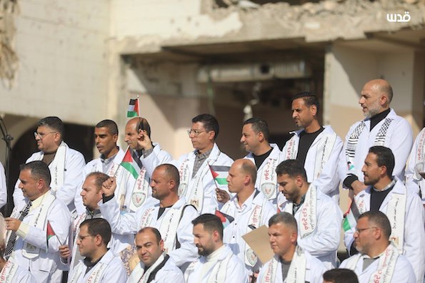 Au milieu des ruines du plus grand hôpital de Gaza, 168 médecins, femmes et hommes palestiniens, ont reçu leurs certifications médicales après la destruction de l’établissement lors d’attaques et de raids israéliens répétés pendant deux années de génocide.