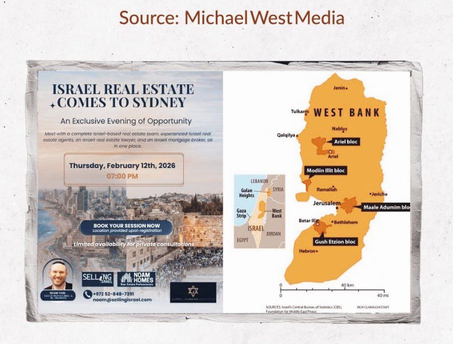 Un rapport de MichaelWestMedia a révélé une campagne de promotion lancée par le lobby israélien en Australie, et plus précisément par l’Association juive australienne, visant à vendre des propriétés situées en territoire palestinien occupé en Cisjordanie à des investisseurs australiens.