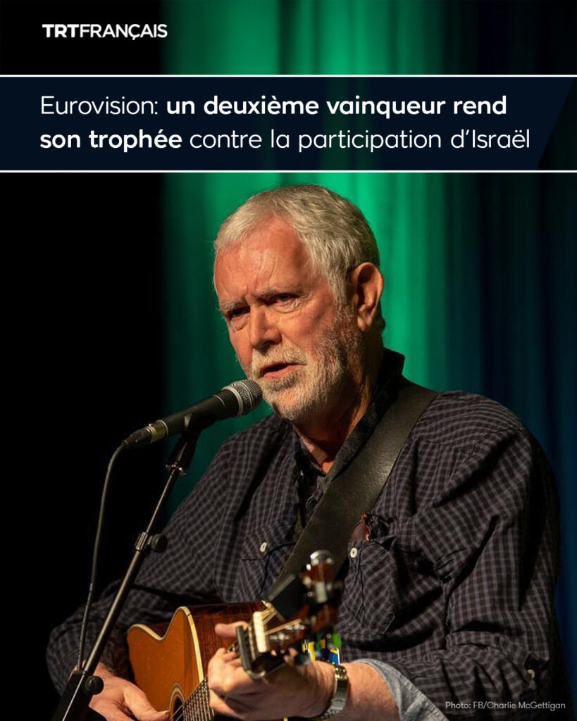 Dans la foulée du Suisse Nemo, l’Irlandais Charlie McGettigan, vainqueur de l’édition 1994 de l’Eurovision, a décidé de lui aussi restituer son trophée en signe de protestation du maintien d’Israël dans la compétition au printemps prochain.