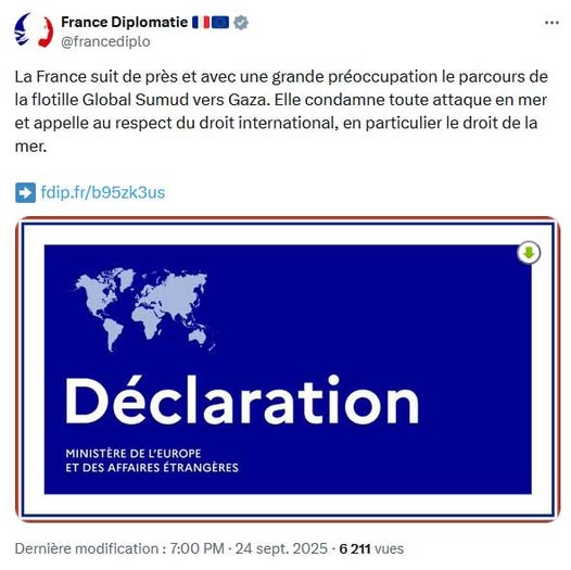 Le ministère français des Affaires étrangères a publié mercredi soir un communiqué de pacotille sur la Flottille et les dangers qui menacent celle. Pacotille, parce qu’aucun engagement n’est pris concernant la défense des citoyens de nationalité française à bord des navires. Et, à la différence de l’Italie et de l’Espagne, Paris se garde d’annoncer l’envoi en Méditerranée de moyens de protection, face à la piraterie du régime génocidaire israélien.