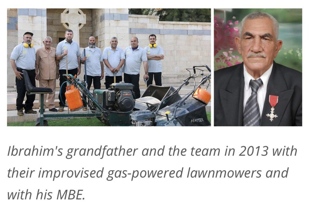 À gauche, l’équipe du cimetière ; à droite le grand-père d’Ibrahim Jaradah, en 2013, avec sa médaille de Membre de l’Empire Britannique