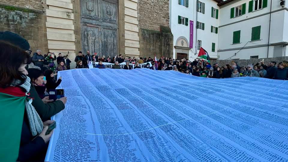Une grande banderole de 25 mètres de long, portant les noms des 18 457 enfants et jeunes tués dans la bande de Gaza a été déployée sur la Place du Carmine à Florence