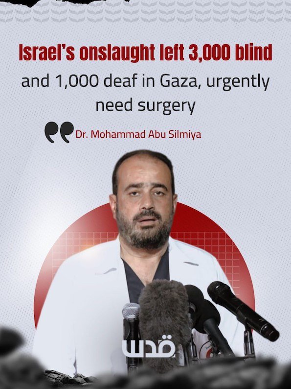 L’attaque génocidaire israélienne contre Gaza, qui a duré plus de 2 ans, a laissé 3 000 personnes aveugles et 1 000 sourdes sur le territoire, dont beaucoup ont besoin d’une intervention chirurgicale urgente, selon le Dr Mohammad Abu Silmiya, directeur du complexe médical Al-Shifa à Gaza.