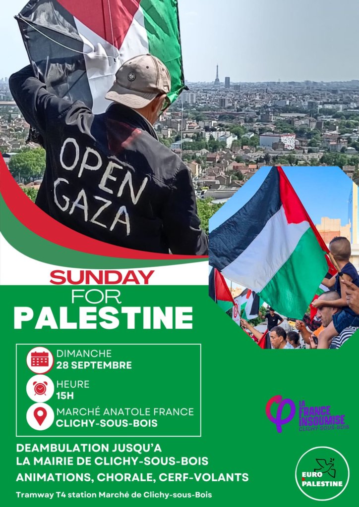 A ne pas rater ce dimanche après-midi, la manifestation à Clichy Sous Bois qui sera accompagnée de plusieurs animations, dont un vol de cerfs-volants, aux couleurs de la Palestine !