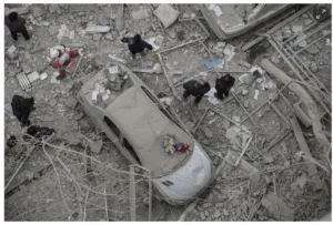 Les choix visuels de Mohsenifar soulèvent eux-mêmes des questions. Dans une série d’images, des scènes de destruction sont juxtaposées à des objets tels que des ours en peluche sur le lieu d’une frappe aérienne, une composition qui accentue l’impact émotionnel.