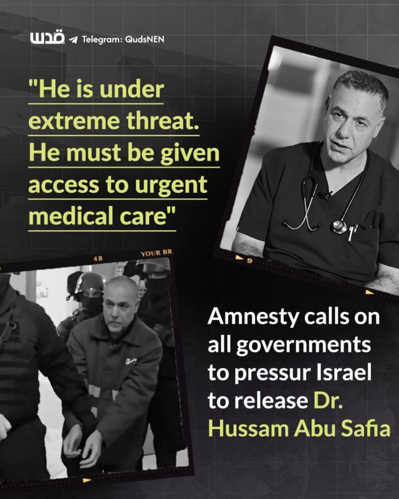 Par ailleurs, les appels se multiplient pour la libération de l’éminent médecin palestinien Hussam Abu Safiya, détenu sans inculpation depuis près de dix mois en Israël après avoir été enlevé par les forces israéliennes lors du génocide de Gaza.