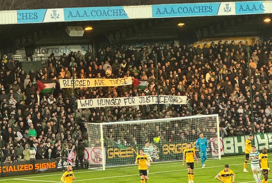 Une banderole déployée par des supporters du Celtic FC, membres de la Green Brigade, a clairement exprimé,ce week-end, leur solidarité avec les grévistes de la faim de Palestine Action en Angleterre.
