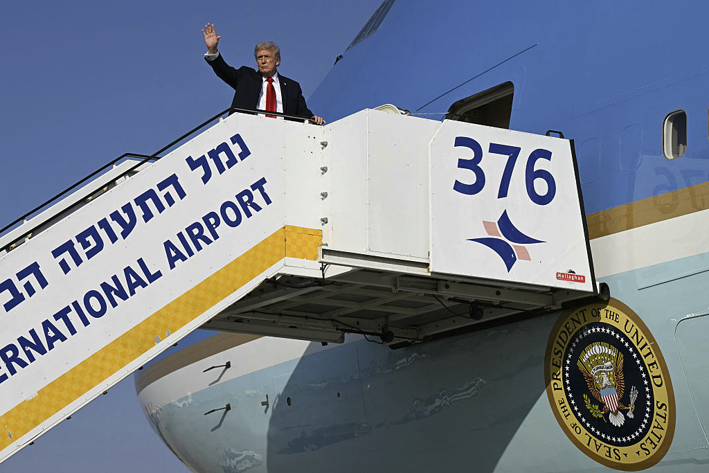 Sur la photo : Trump salue de la main avant d’embarquer à bord d’Air Force One à l’aéroport Ben Gourion en Israël, le 13 octobre 2025, en route pour l’Égypte. (Photo de Saul Loeb/AFP via Getty Images)