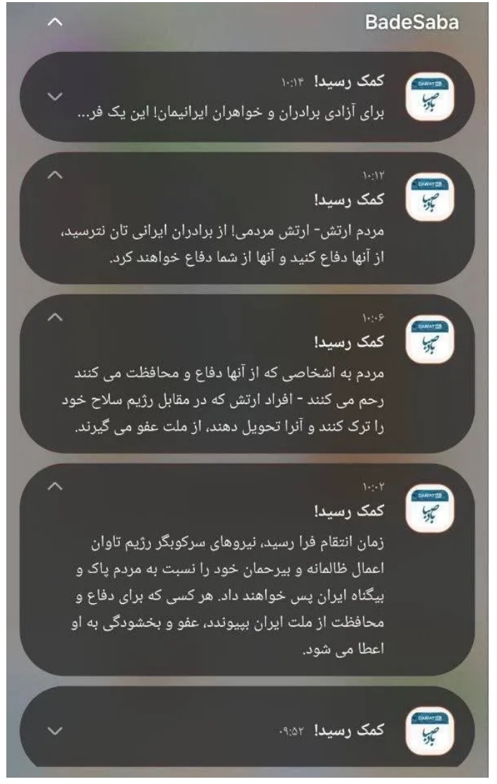 « L’heure de la vengeance a sonné », pouvait-on lire dans une notification reçue à 10h02 (traduction du farsi). « Les forces répressives du régime paieront pour leurs actes cruels et impitoyables commis contre le peuple innocent d’Iran. Quiconque se joint à la défense et à la protection de la nation iranienne bénéficiera de l’amnistie et du pardon. »