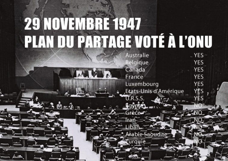 Ce jour-là, l’Assemblée générale des Nations Unies adopta le plan sous la forme de la résolution 181, par 33 voix contre 13, avec 10 abstentions et une absence. Cette résolution apporta un soutien international à la création de l’État d’Israël, qui fut admis comme membre à part entière des Nations Unies le 11 mai 1949.