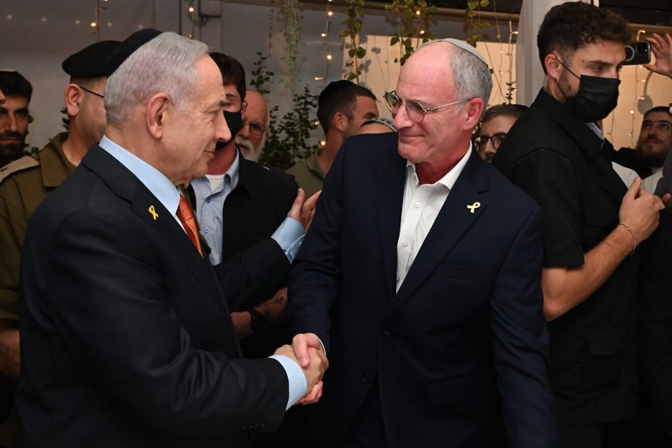 Le Premier ministre israélien Benjamin Netanyahu serre la main de Yechiel Leiter, ambassadeur d’Israël aux États-Unis, lors d’une cérémonie de dédicace de la Torah à Jérusalem en l’honneur du fils de Leiter, le major (réserviste) Dr Moshe Yedidya Leiter, tué à Gaza le 18 novembre 2025. Crédit : Haim Zach/GPO.