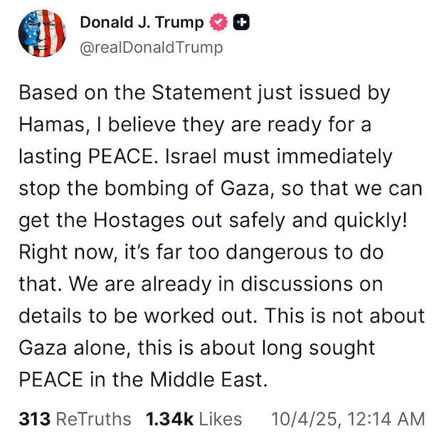 Le Hamas a accepté vendredi la proposition de plan de paix émise par Trump, c’est a dire la restitution en une seule fois des 48 otages israéliens vivants et morts, ainsi que la mise en place provisoire d’un comité de gestion palestinien de « technocrates » pour gérer la bande de Gaza, tout en soulignant la nécessité de respecter en échange les clauses sur le retrait de l’armée israélienne, l’arrêt des massacres, la libération des otages palestiniens et la mise en place d’un Etat palestinien autonome.