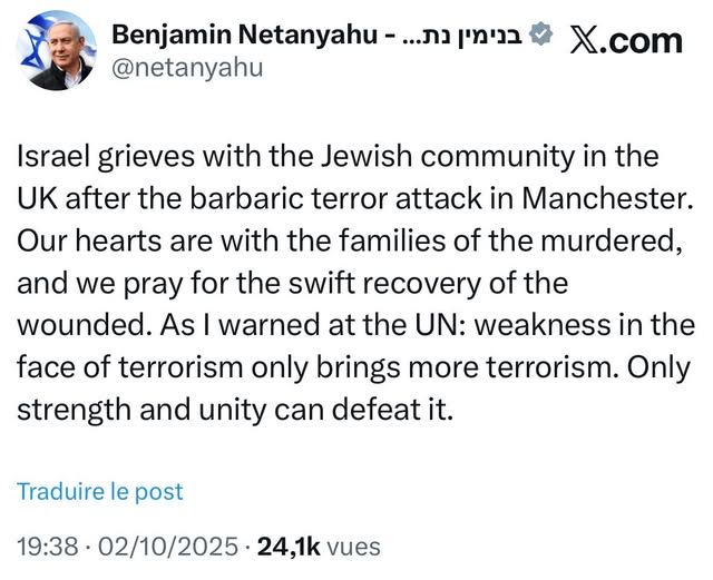 Deux personnes ont été tuées lors d’une attaque à la synagogue de Heaton Park, à Manchester. Le terroriste a été tué sur place. Trois autres personnes ont été arrêtées, soupçonnées d’implication dans l’attaque. Selon un communiqué de la police, le suspect portait ce qui semblait être un gilet explosif. La police a qualifié l’attaque d’« incident terroriste » et a renforcé ses patrouilles dans tout le royaume.