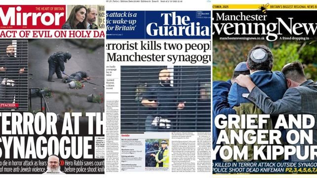 « 7 minutes de mal », titrait le Sun, tandis que la première page du Daily Mirror annonçait : « Un acte maléfique un jour saint : la terreur dans une synagogue. »