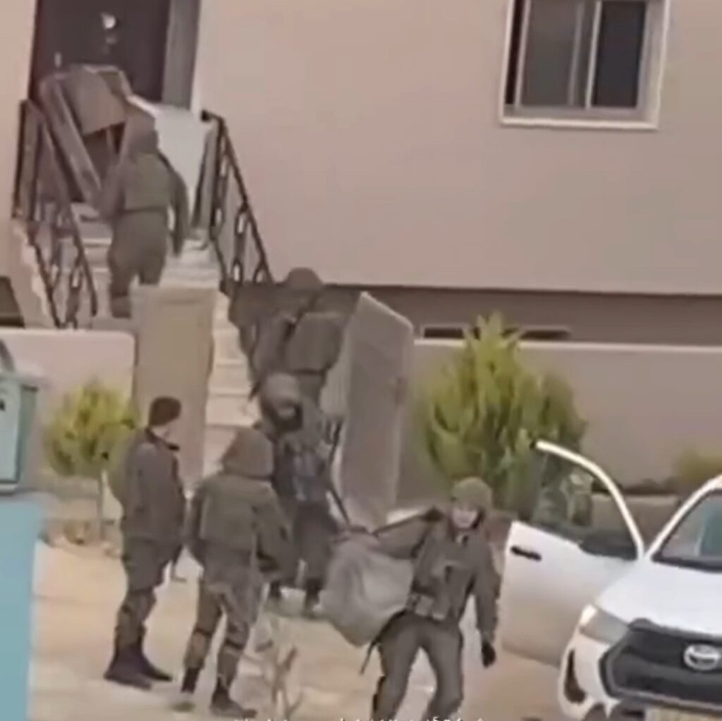 Des soldats israéliens en flagrant délit de vol des biens palestiniens pendant leur raid dans les maisons du village de Rammadin, au sud d’Hébron, en Cisjordanie