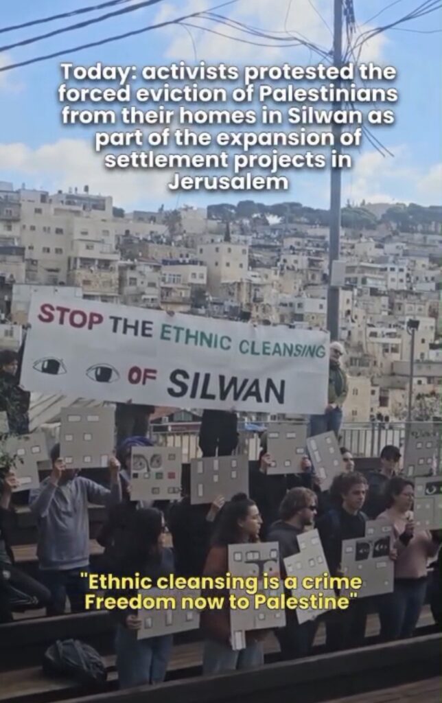 La manifestation s’est déroulée au sein d’un projet de colonisation qui confisque les terres des palestiniens. Les militants ont exprimé leur solidarité avec les habitants du quartier et ont souligné que le site touristique des colons « Cité de David » sert de couverture à un projet violent et raciste.
