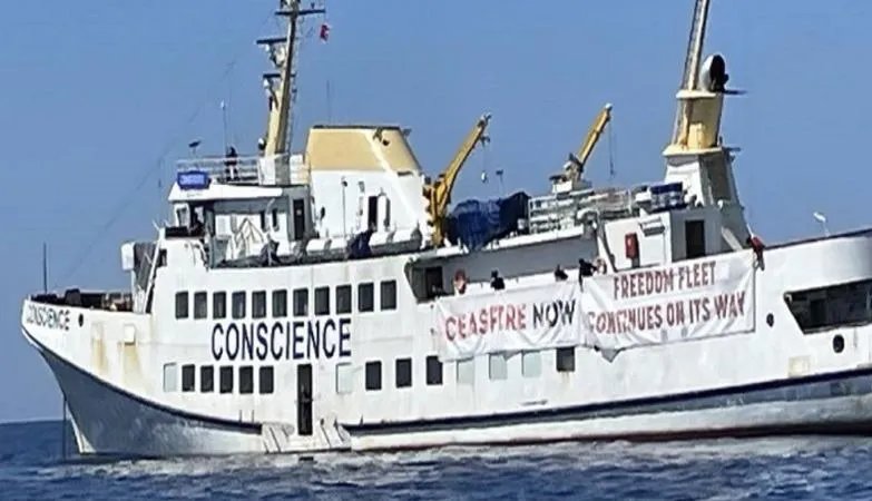 Parmi les 11 navires des « Thousand Madleens » qui ont pris le départ plusieurs jours après la Sumud avec le même objectif, briser le blocus de Gaza, le gros bateau nommé « Conscience ».
