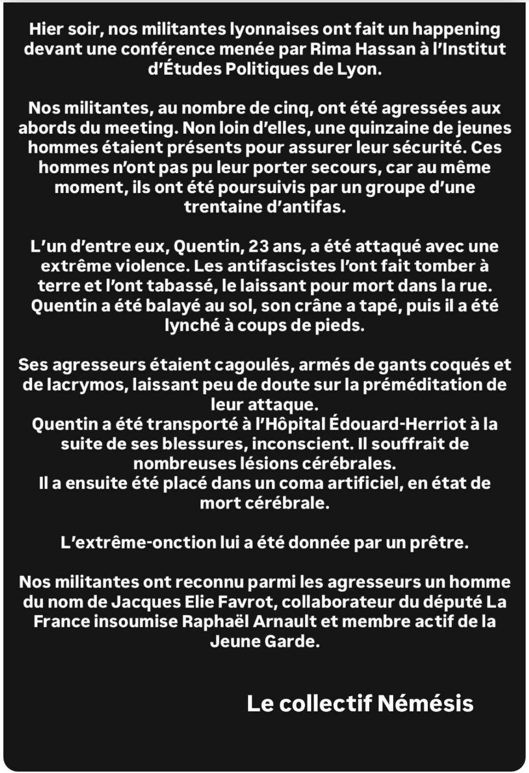 Quentin D., 23 ans, est mort samedi 14 février, a annoncé le parquet de Lyon. Le jeune homme assurait informellement et bénévolement la sécurité d’une action du collectif identitaire et féministe Némésis jeudi devant l’IEP de Lyon où se tenait une conférence de l’eurodéputée insoumise Rima Hassan. «C’était une action organisée par notre antenne lyonnaise, 5 ou 6 filles étaient présentes et des hommes bénévoles s’étaient postés un peu plus loin, prêts à intervenir et à faire le service d’ordre si les militantes étaient prises à partie», a expliqué Alice Cordier, la présidente du collectif, au Figaro .