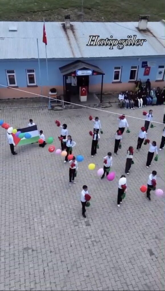 Des élèves turcs célèbrent la Journée des enfants turcs en chantant l’hymne palestinien tout en hissant le drapeau palestinien.