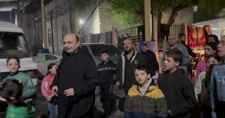 Malgré la noirceur de la situation à Gaza, des enfants chrétiens palestiniens se rassemblent à l’intérieur de l’église catholique de la Sainte Famille avec leur curé, pour chanter des chants de Noël et se réconforter un peu.