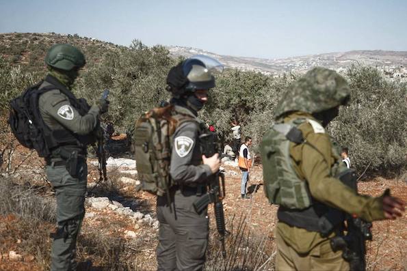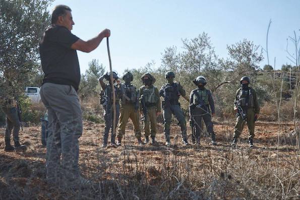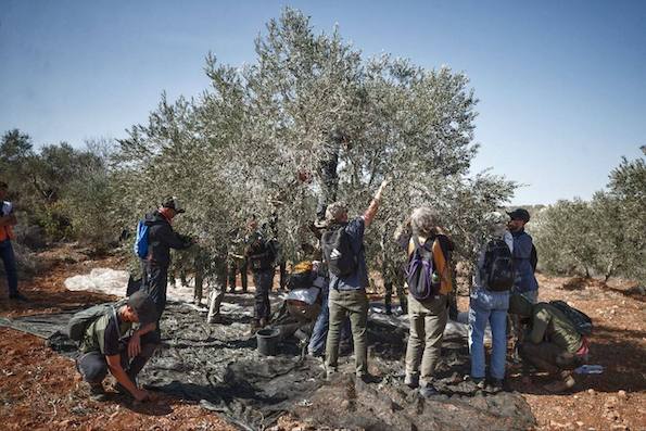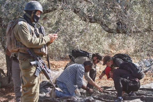 Des habitants palestiniens de Beita, au sud de Naplouse, accompagnés de plusieurs sympathisants, continuent à récolter les olives sur leurs terres malgré la présence des forces d’occupation i et des milices de colons.