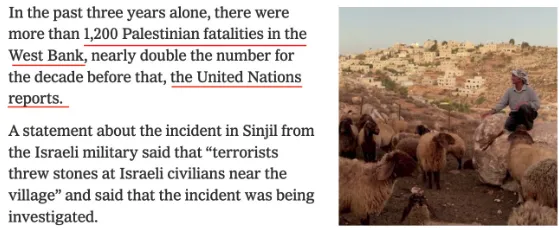 Des données sélectives alimentent un récit trompeur : le New York Times s’appuie sur des statistiques de l’ONU concernant les victimes, qui ne font pas la distinction entre civils et terroristes, ce qui amplifie les allégations de « violence des colons » tout en présentant des données erronées comme des faits avérés.