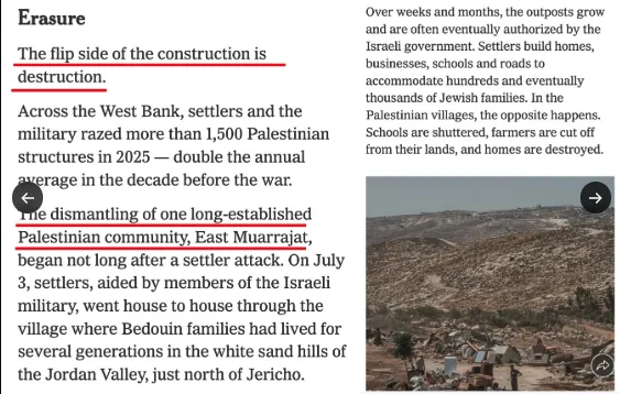 Le troisième élément biaisé de l’article réside dans la narration visuelle, qui renforce le récit. Les images de maisons démolies et de paysages dévastés suggèrent des déplacements de population délibérés. Or, le cadre juridique régissant une grande partie du territoire est à peine expliqué. De nombreuses démolitions ont lieu dans la zone C, qui, en vertu d’accords internationalement reconnus , relève de l’autorité civile et sécuritaire israélienne. Toute construction y est soumise à autorisation. Les constructions non autorisées, qu’elles soient palestiniennes ou israéliennes, sont passibles de poursuites. En omettant ce contexte, la réglementation est présentée comme une expulsion.