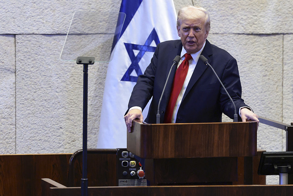 Photo : Le président américain Donald Trump s’adresse à la Knesset, le Parlement israélien, le 13 octobre 2025 à Jérusalem. (Photo d’Evelyn Hockstein/Pool/Getty Images)