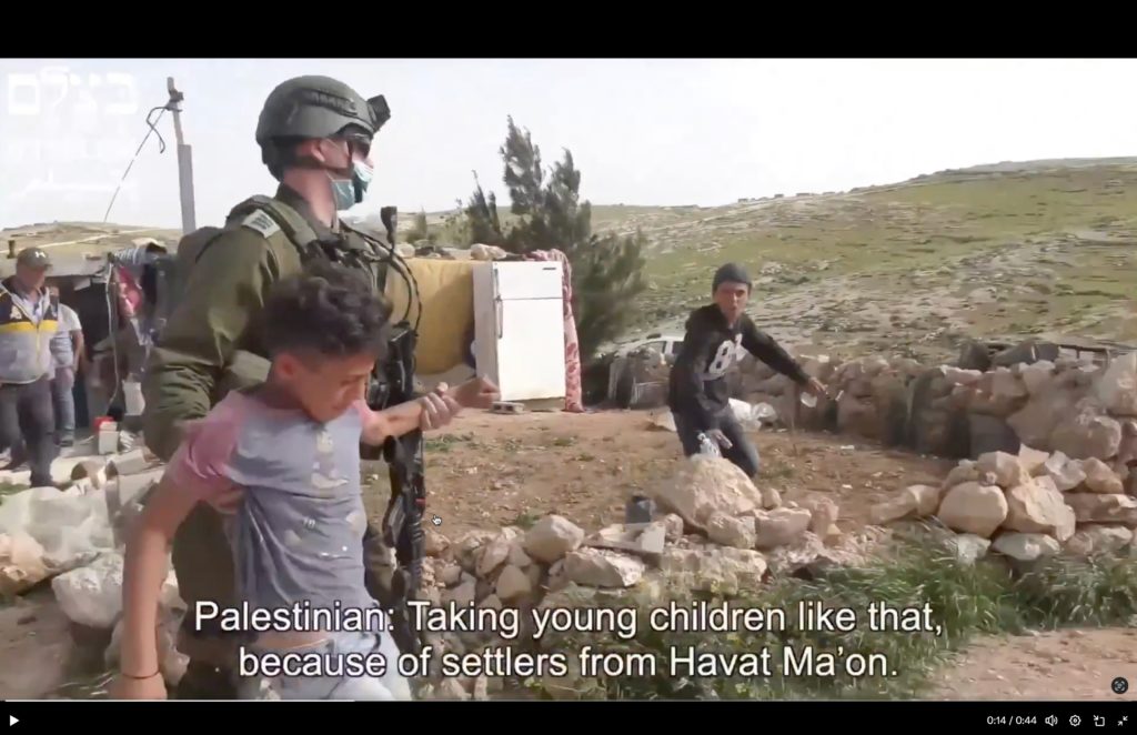 Scène de la vie quotidienne en Cisjordanie occupée. Un enfant est arrêté par la soldatesque israélienne sur injonction des colons.