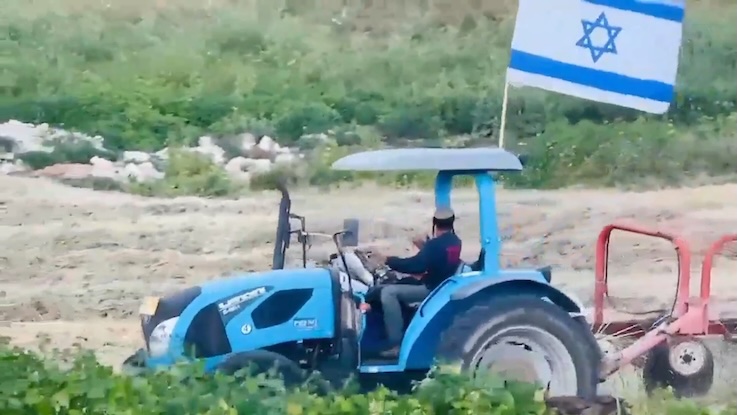 Le colon Elyashiv Nachum, propriétaire de l’ »avant-poste » colonial « Havat Yehuda », ainsi que d’autres colons, envahissent des terres palestiniennes privées en Cisjordanie, dans le village de Wadi Tiran avec un tracteur et récoltent du blé dans le but de prendre le contrôle de la zone.