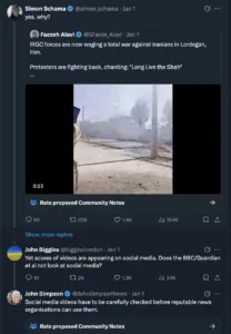 Il s’agit de la même BBC qui a diffusé à maintes reprises des images et des photographies non vérifiées – ou à peine vérifiées – en provenance de Gaza. En Iran, cependant, la vérification est soudainement devenue un obstacle insurmontable, alors même que des dizaines de vidéos provenant de plusieurs villes montraient des scènes, des slogans et des schémas de troubles similaires.