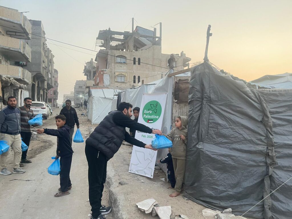 Encore une distribution de riz et de poulet ce dernier dimanche de ramadan aux familles palestiniennes déplacées dans le campement de de Shati, devenu un triste bord de mer où les tentes risquent à chaque moment d’être englouties par la mer, quand les tirs israéliens ne viennent pas terroriser la population.