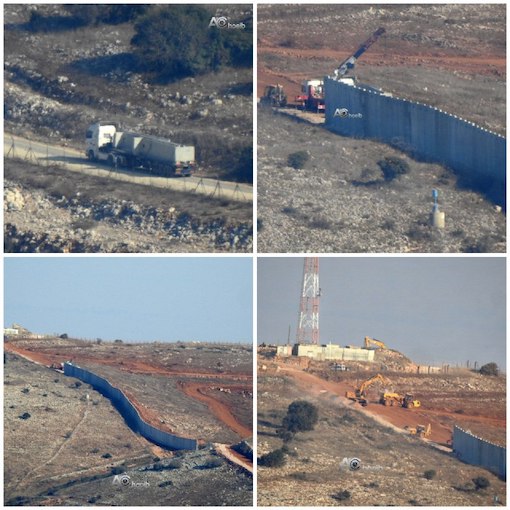L’occupant israélien construit un mur de béton le long de la frontière libanaise, derrière la Ligne bleue, entre la colonie d’Avivim et le point militaire de Jal al-Deir, en face des villes de Maroun al-Ras et d’Aitaroun, au sud du Liban.
