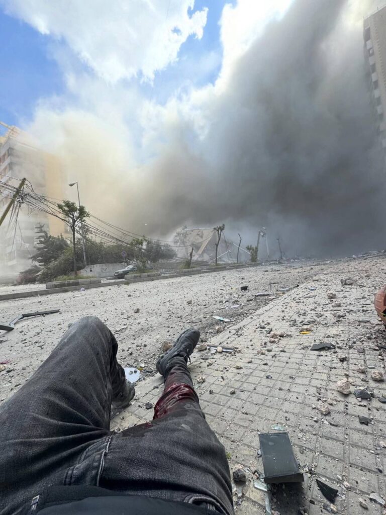 Haytham Al-Moussawi, photographe en chef du quotidien libanais Al-Akhbar, a été blessé lundi par des éclats d’obus alors qu’il couvrait les attaques israéliennes sur la banlieue sud de Beyrouth