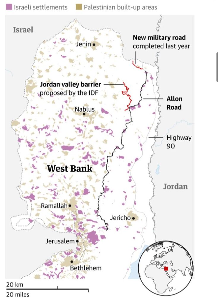 La « ligne rouge » a pour objectif de voler une partie importante de la Cisjordanie, dont toute la Vallée du Jourdain, et Israël aurait commencé la construction de la barrière qui traversera certaines des terres agricoles palestiniennes les plus fertiles de Cisjordanie, en commençant par le village d’Atouf, dans le nord de la vallée du Jourdain, rapporte The Guardian.
